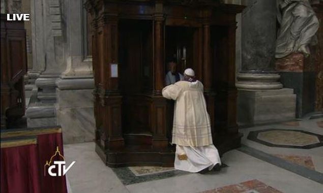 Il primo ad essere visibilmente sorpreso è stato il cerimoniere, monsignor Guido Marini. Aveva accompagnato il papa fin al confessionale a lui riservato. Tutto pronto: la fila di fedeli in attesa del proprio turno, il giusto clima di raccoglimento, i canti di sottofondo, altri 61 preti pronti ad amministrare il sacramento della Riconcliazione.Ma Jorge Mario Bergoglio ha deciso altrimenti. E ha puntato deciso un altro confessionale, inginocchiandosi faccia a faccia di fronte a un sacerdote. Il Papa ha dato l’esempio confessandosi lui per primo.