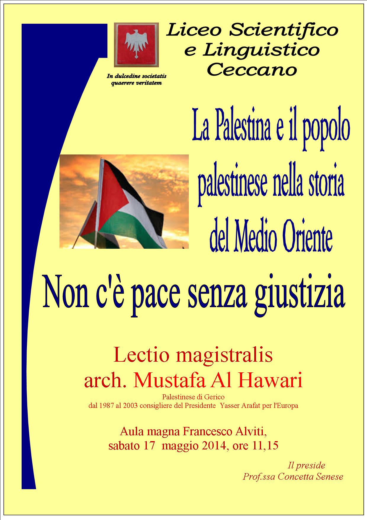 Non c’è pace senza giustizia, la storia, la cultura, la cultura del popolo palestinese: è il tema della Lectio Magistralis dell’arch. Mustafà al Hawari, palestinese di Gerico, dal 1987 al 2003 consigliere del Presidente Yasser Arafat per l’Europa. Il dramma del popolo palestinese sarà evocato nell’aula magna Francesco Alviti, sabato 17 maggio, alle ore 11,10. L’arch. Al Hawari racconterà la sua esperienza agli allievi del Liceo di Ceccano ed analizzerà gli elementi storici del conflitto palestinese, con elementi di geopolitica e più squisitamente culturali. La lectio magistralis è inserita nel progetto dell’incontro con il pensiero contemporaneo, offerto a tutti gli allievi del Liceo, come opportunità di formazione e di confronto con realtà che a volte ci sfuggono per la loro forte complessità.