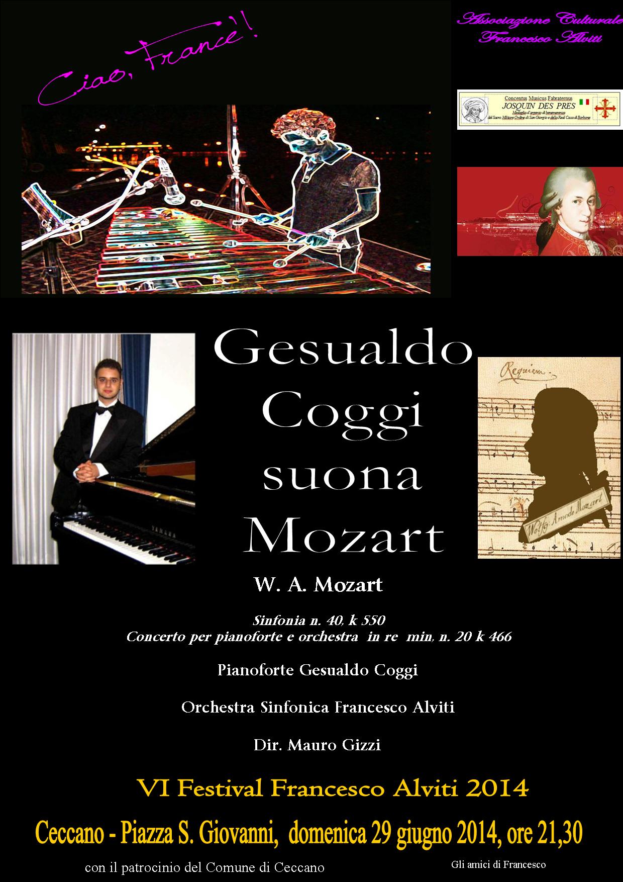 Coggi suona Mozart, il sublime al Festival Francesco Alviti, domenica 29 giugno alle ore 21,30 in Piazza S. Giovanni Sarà Gesualdo Coggi, il giovane pianista frusinate, terzo classificato al concorso internazionale Ferruccio Busoni, un vero e proprio campionato del mondo per i talenti musicali, ad interpretare il Concerto n. 20 in re minore del grande compositore salisburghese. Con lui ci sarà l’Orchestra Sinfonica Francesco Alviti, diretta da Mauro Gizzi, che eseguirà anche la Sinfonia n. 40. Sarà la V serata del Festival che a Ceccano sta riscuotendo grande successo di pubblico e consenso di critica. Dopo the Queen Symphony con il Coro Josquin Des Pres e l’Orchestra di Fiati Città di Ferentino, il Lab in Time dei percussionisti con le emozioni di una serata riverberante di ricordi, sensazioni, intuizioni, è stata la volta degli Ica brothers con la loro musica