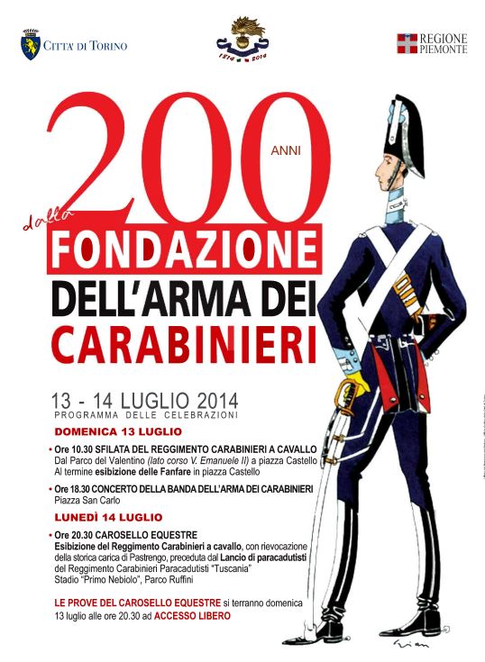 della città di Torino, l’inaugurazione della Stazione Carabinieri di Torino “Barriera Milano” ed infine l’esibizione del famoso Carosello equestre eseguito dal 4° Reggimento Carabinieri a Cavallo presso lo stadio “Primo Nebiolo”. Inoltre, nelle serate del 12, 13 e 14 luglio, il logo del Bicentenario di Fondazione dell’Arma, appositamente realizzato per suggellare tali eventi, sarà proiettato sulla Mole Antonelliana, che domina i cieli torinesi.