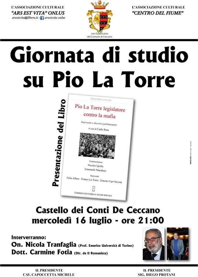 Ci saranno Nicola Tranfaglia, più volte parlamentare ed insegnante di storia contemporanea all’Università di Torino, e Carmine Fotia, giornalista, direttore de Il Romanista a parlare di mafia e storia d’Italia a Ceccano, al Castello dei Conti alle ore 21 di oggi, mercoledì 16 luglio. Al centro dell’attenzione la vicenda di Pio La Torre, parlamentare ucciso dalla mafia. Appuntamento da non perdere