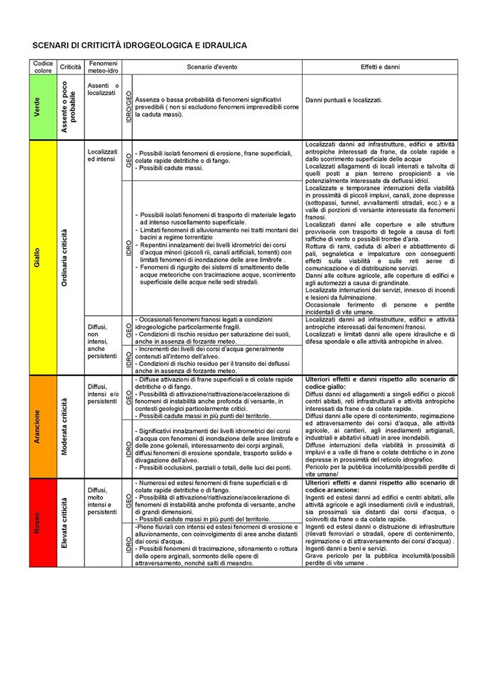 I possibili effetti al suolo associati ai diversi livelli di criticità sono consultabili nella Tabella degli Scenari di criticità idrogeologica ed idraulica