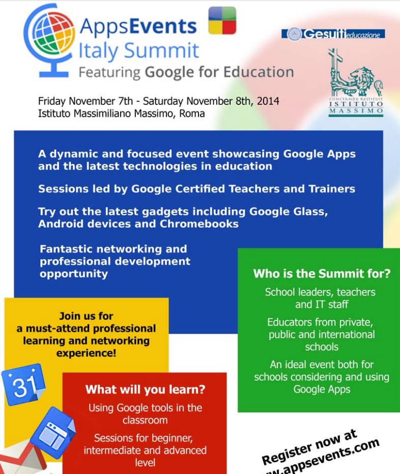 Una delegazione del Liceo di Ceccano parteciperà all’Apps Event Italy Summit che si svolgerà a Roma presso l’Istituto Massimo il 7 e l’8 novembre. Si tratta della manifestazione nazionale di presentazione e di approfondimento per Google for Education. Il Liceo di Ceccano ha adottato le Google apps for education per tutti i suoi studenti e i suoi prof che normalmente utilizzano per la comunicazione, la condivisione e la trasmissione di materiali multimediali.