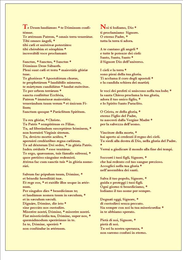 L’inno Te Deum laudamus, con cui tradizionalmente ringraziamo il Signore Dio dei benefici da Lui ricevuti, pure se detto “inno ambrosiano”, è una composizione poetica adesso attribuita con certezza a Niceta di Remesiana, intorno all’anno 400.Originariamente si rivolgeva a Cristo Dio e Signore: “Te (o Cristo) noi lodiamo Dio! Te (o Cristo) noi professiamo Signore!”. Successivamente, con l’attenuarsi delle eresie sulla Persona Divina e sulla Divina Signoria di Gesù, poco alla volta la pietà cristiana lo ha indirizzato al Padre e al Figlio e allo Spirito; infatti, con questa qualificazione trinitaria noi lo abbiamo recepito e a nostra volta lo trasmettiamo. Nella Chiesa cattolica il Te Deum è legato alle cerimonie di ringraziamento; viene tradizionalmente cantato la sera del 31 dicembre, per ringraziare dell’anno appena trascorso, oppure nella Cappella Sistina ad avvenuta elezione del…