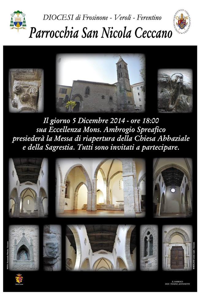 Sarà il vescovo, mons. Ambrogio Spreafico, venerdì 5 dicembre a restituire al culto la Chiesa di S. Nicola a Ceccano, dopo i lavori di restauro. In questi giorni sono tutti al lavoro per la cura dei particolari e per rendere il luogo sacro sempre più bello. L’appuntamento è alle ore 18.
