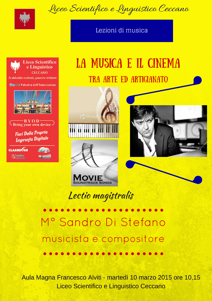 L’importanza della musica nei film, l’attrice invisible come viene definita, sarà il tema della lectio magistralis che il m° Sandro Di Stefano, affermato compositore di musica per produzioni cinematografiche e televisive, terrà martedì 10 marzo al Liceo di Ceccano, nell’ambito del progetto Lezioni di musica, inserito nel programma Musica a scuola. Quanti di noi al momento in cui ascoltano la colonna sonora di un film ne rivedono immeditamente i fotogrammi, rivevendo le emozioni della proiezione? L’incontro è destinato a tutti coloro che sono interessati ad approfondire un elemento chiave del cinema e della realizzazione audiovisiva. Il rapporto “emozionale” tra musica e immagini verrà svelato, raccontato, approfondito. Verranno presentati i possibili intrecci che legano narrazione filmica e narrazione sonora senza lasciar fuori strumenti e temi legati alla drammaturgia musicale nel cinema che appartengono potentemente al mondo del racconto tramite la traccia sonora. Durante l’incontro verranno illustrate tutte le tecniche compositive applicabili alle immagini.