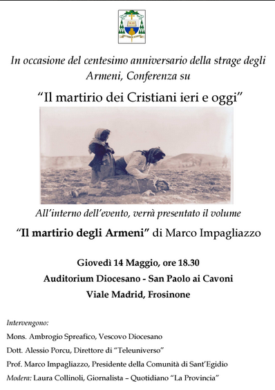 Il dolore, le stragi, l’esilio, il martirio del popolo armeno sarà ricordato a Frosinone con la presentazione di un libro di Marco Impagliazzo. Ne dàò così notizia il sito della diocesi: in occasione del centesimo anniversario della strage degli Armeni, la Diocesi di Frosinone organizza la Conferenza “Il martirio dei Cristiani ieri e oggi”. All’interno dell’evento, verrà presentato il volume “Il martirio degli Armeni” di Marco Impagliazzo: oltre all’autore, intervengono il vescovo Ambrogio Spreafico e il dott. Alessio Porcu, Direttore di “Teleuniverso”, modera Laura Collinoli, Giornalista del Quotidiano “La Provincia” (ore 18.30, Auditorium diocesano).