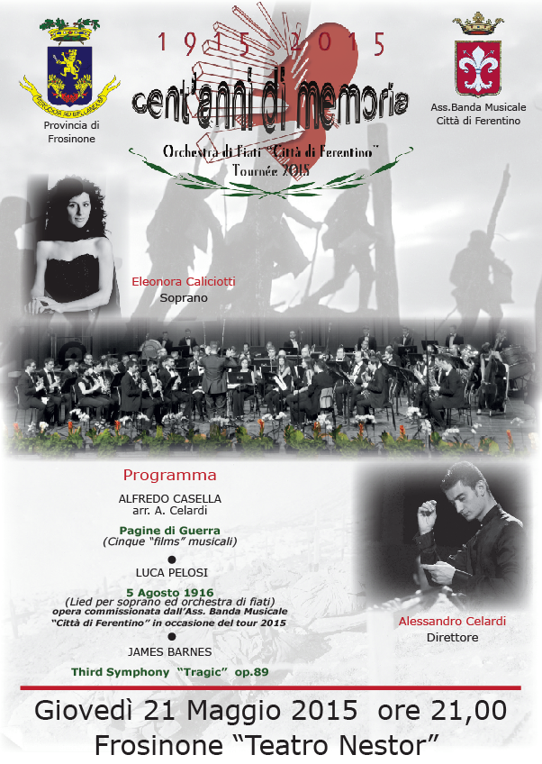100 anni fa centinaia di migliaia di giovani italiani venivano mobilitati, vestiti di grigiovedre, armati di fucile e spediti al fronte. Il Piave mormorava pensando a quanti di quei giovani non sarebbero tornati., quanta sofferenza avrebbe travolto gli entusiasmi quei giorni che poi furono chiamati il maggio radioso. L’orchestra di Fiati della Città di Ferentino celebrerà i 100 anni della 1a Guerra Mondiale con un concerto a Teatro Nestor di Frosinone, giovedì 21 maggio, alle ore 21. In programma musiche di Casella e Pelosi.