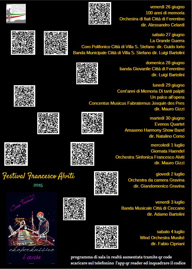 Un festival in realtà aumentata: molto semplice, è sufficiente portare il proprio smartphone per seguire i concerti con tutte le informazioni necessarie. Basta avere sul telefono un applicazione per la lettura dei qr code e puntare il quadratino bianco e nero presente sul programma in corrispondenza del concerto del giorno: si apriranno automaticamente le pagine con centinaia di video, informazioni sul programma, immagini. Un semplice foglio di carta, un sito web e un telefonino che da oggi diventa alleato non nemico dei concerti e della musica. Provare per credere. Da stasera, 26 giugno, al 4 luglio, a Ceccano in Piazza S. Giovanni, ore 21,30