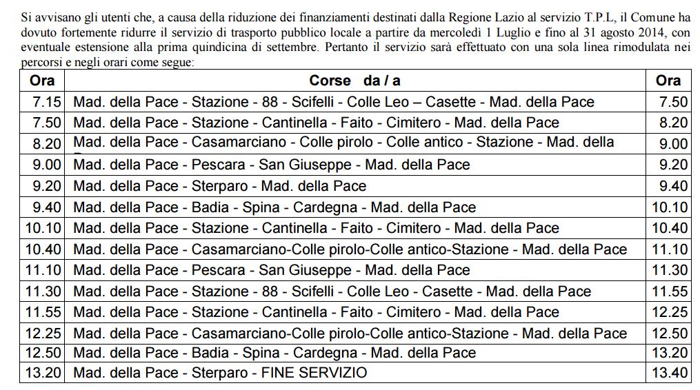 Qualche semplice considerazione: il fatto che la riduzione sia in atto dal 1° luglio e nessuno se ne sia accorto mostra l’importanza del trasporto pubblico a Ceccano; le linee non sembrano coordinate con il resto del trasporto pubblico (treni e bus del cotral); il trasporto comunale appare tutto rivolto verso le contrade piuttosto che assicurare un efficiente servizio all’interno del centro cittadino; e poi c’è la chicca dell’orario antimeridiano, sembra una tabella studiata per il mercato del mercoledì. Chi arriva a Ceccano, alla stazione, dopo le 13, devi affidarsi ai suoi piedi… Anno del Signore 2015