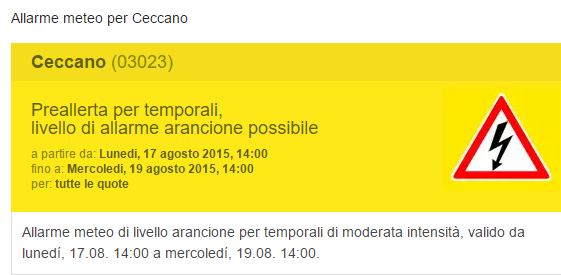 Una preallerta (livello GIALLO) viene emessa con fino a 48 ore di anticipo, quando l’insorgere del maltempo è ancora incerto oppure si possono verificare cambiamenti nello svolgimento temporale, così come nell’intensità oppure nella direzione dell’evento.