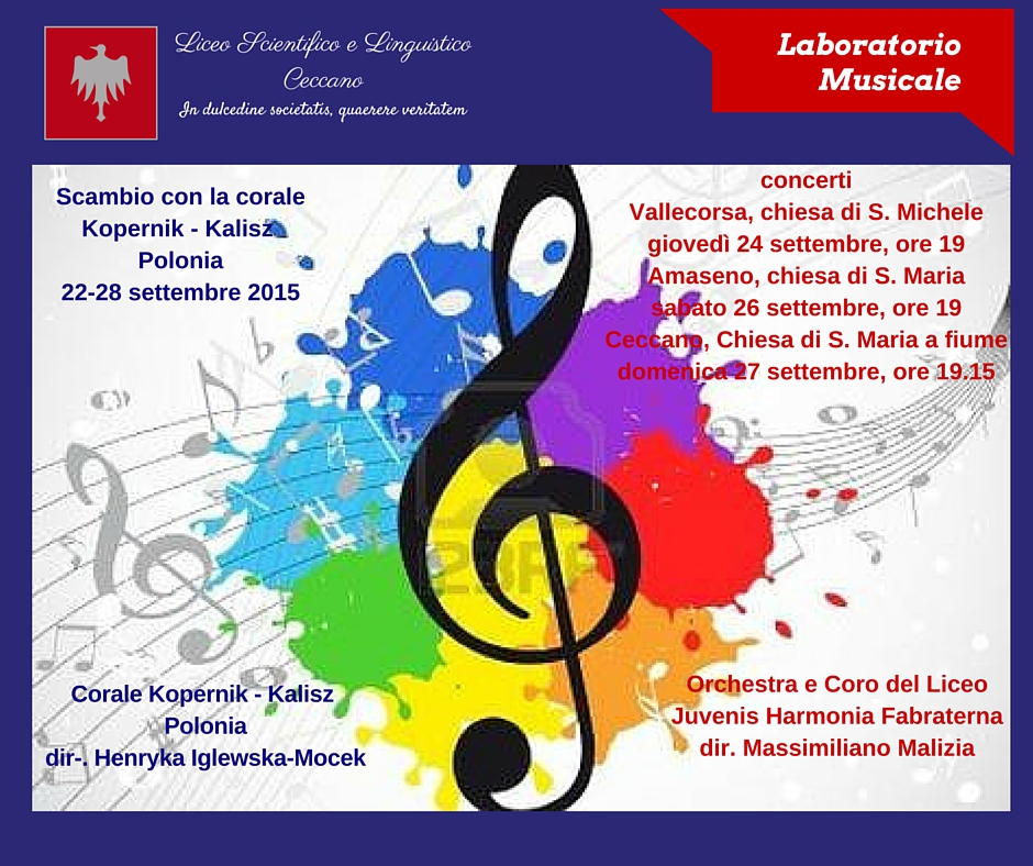 Ecco il programma dei tre concerti della Corale Kopernik di kalisz, Polonia, in scambio con il liceo di Ceccano