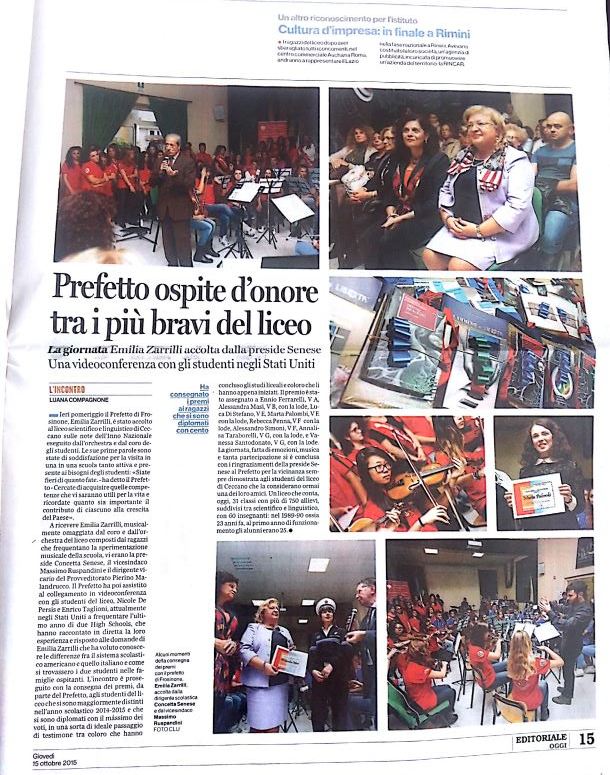 Vengo sempre con sommo piacere perché non soltanto mi sento ben accolta ma perché voglio darvi un grande incoraggiamento per tutto quello che fate. Ormai, questo istituto rappresenta per me una vera eccellenza di questo territorio. Lo è in senso assoluto ma siete per me un orgoglio: fate parte di quelle cose belle della nostra terra. Vi seguo dai giornali, grazie per quello che fate!