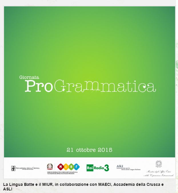 Torna mercoledì 21 ottobre per il terzo anno consecutivo, dopo il successo delle prime due edizioni, la Giornata proGrammatica che Rai Radio3 – La Lingua Batte organizza con il Miur – Ministero dell’Istruzione dell’Università e della Ricerca e il Maeci – Ministero degli Affari Esteri e della Cooperazione Internazionale, in collaborazione con Accademia della Crusca e Asli – Associazione per la Storia della Lingua Italiana. L’evento è volto a sensibilizzare e ad appassionare i ragazzi all’uso corretto dell’italiano attraverso una chiave di lettura ogni anno nuova: nella prima edizione la grammatica, lo scorso anno la punteggiatura, questa volta l’italiano delle canzoni. La Giornata, che prevede una maratona tra la radio e le scuole italiane per promuovere e valorizzare la nostra lingua in tutti i suoi aspetti, sarà infatti dedicata a: l’italiano della musica, la musica dell’italiano.