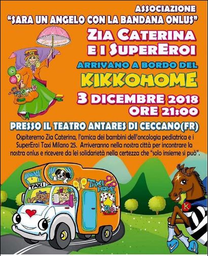 Zia Caterina ed i supereroi per fare del bene subito con l’Associazione Sara, un angelo con la bandana, al teatro Antares di Ceccano, il 3 dicembre 2018, alle ore 21. Con Zia Caterina ci saranno gli amici Supereroi Taxi. Dunque stasera tutti a bordo del kikkohome per aiutare i bambini ricoverati nei reparti di oncologia pediatrica
