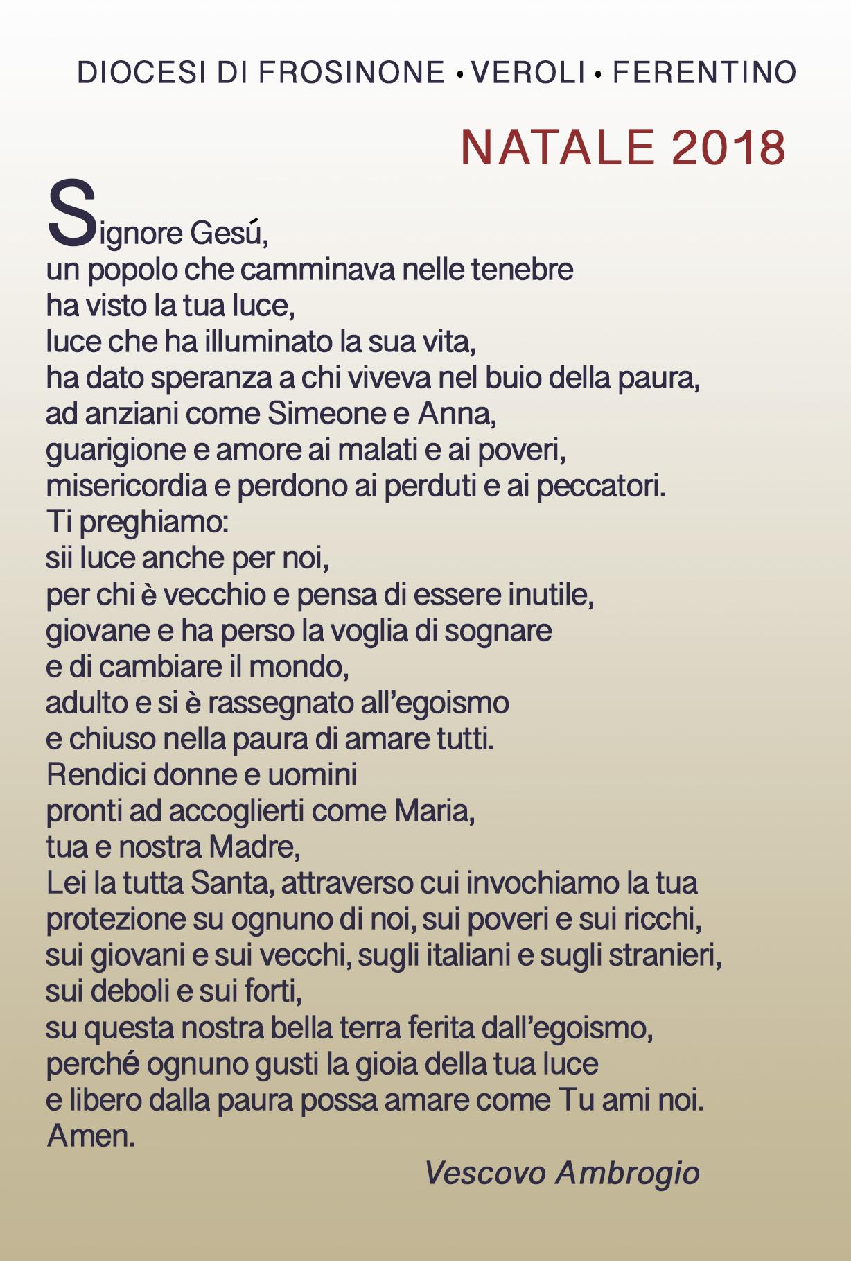 per chi è vecchio e pensa di essere inutile, giovane e ha perso la voglia di sognare e di cambiare il mondo, adulto e si è rassegnato all’egoismo e chiuso nella paura di amare tutti. Così mons. Ambrogio Spreafico nella sua preghiera di Natale che viene donata a tutti coloro che oggi parteciperanno alle Messe della Diocesi di Frosinone