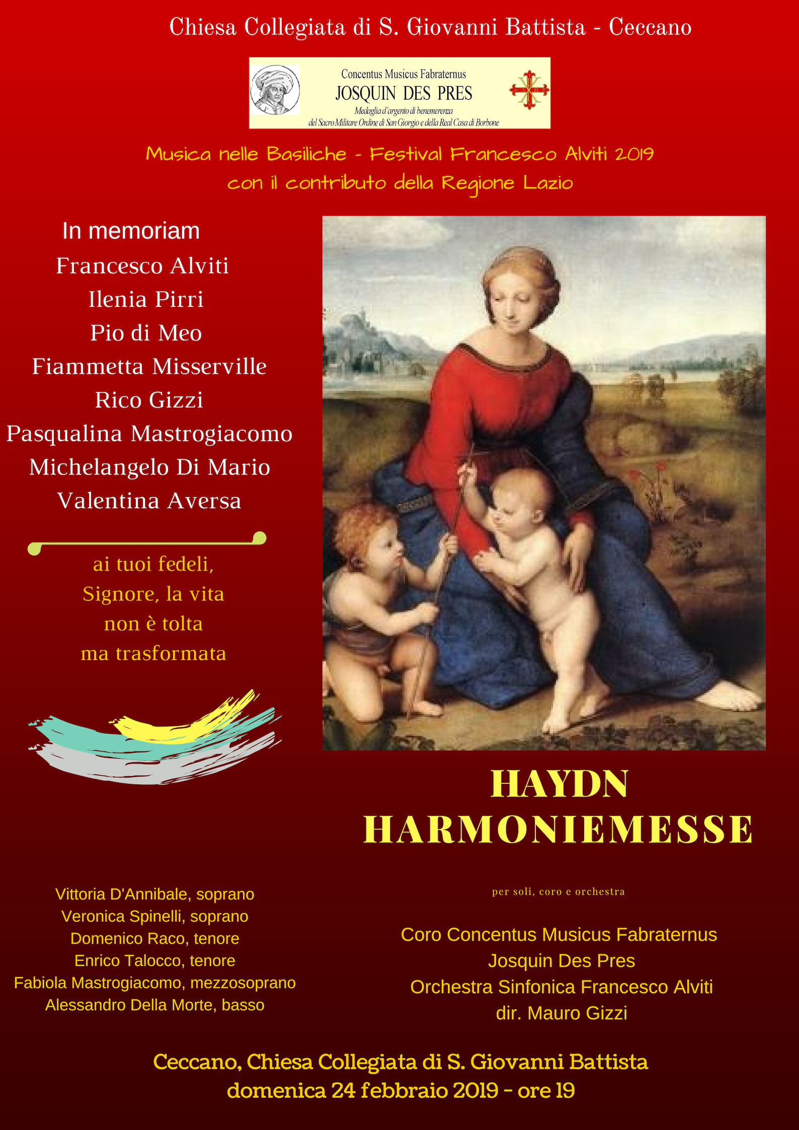Harmoniemesse sarà presentata domenica 24 febbraio 2019 alle ore 18,45, nella Collegiata di S. Giovanni battista a Ceccano , dall’orchestra sinfonica Francesco Alviti e dal Concentus Musicus Fabraternus Josquin Des Pres, diretto da Mauro Gizzi. Le voci soliste saranno quelle dei soprani Vittoria D’Annibale e Veronica Spinelli, del mezzosoprano Fabiola Mastrogiacomo, dei tenorI Domenico Raco ed Enrico Talocco e del basso Alessandro Della Morte. Al pianoforte ci sarà Chiara Olmetti e all’organo Alessandra Maura. Il concerto si inserisce nel programma Musica nelle basiliche 2019 che gode del contributo della Regione Lazio
