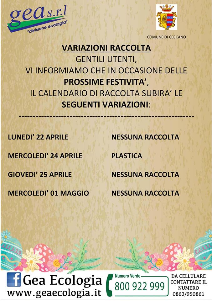 Brutte notizie per le famiglie di Ceccano, per la differenziata: secondo un avviso presente soltanto sullla pagina facebook di Gea ecologia, azienda incaricata della raccolta, domani 22 aprile non sarà effettuato alcun servizio. Pertanto, almeno secondo quello che si legge sulla pagina, l’organico verrà ritirato soltanto venerdì 26. Non vi pare un po’ pochino?