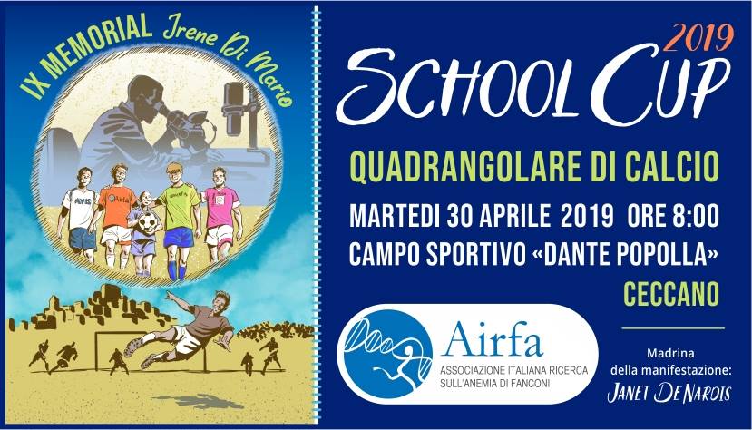 Martedì 30 aprile la solidarietà in campo con la School Cup, il torneo di calcio che vede coinvolte le scuole superiori di Ceccano e di Ceprano, in un’azione solidale con la ricerca contro le malattie genetiche dell’Airfa, l’Associazione per la ricerca sull’anemia di Fanconi. Il torneo è in memoria della giovane Irene di Mario, scomparsa dieci anni fa.