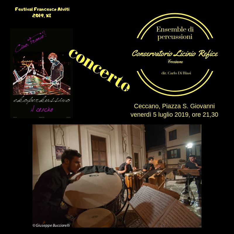 Al Festival Francesco Alviti arrivano i percussionisti, venerdì 5 luglio, in piazza S. Giovanni, a Ceccano, alle 21,30, ci sarà l’Ensemble di percussioni del Conservatorio Licinio Refice, diretto da Carlo De Blasi, con un concerto in cui saranne eseguiti brani di Sollima, Cage, Markovic, Reich, Broadman. affidati alle bacchette e alle dita di Matteo Alonzi, Fabrizio Candidi, Federico Gizzi, Giuseppe Iazzetta, Paolo Martini, Emanuela Olivelli, Luca Venzelini, Fabrizio Bartolini e Carlo Di Blasi. L’appuntamento è per le ore 21,30 in Piazza San Giovanni che si riempirà del rombo dei tamburi. Il Festival proseguirà poi lunedì 8 luglio (e non domenica 7 per evitare una sovrapposizione con un’altra manifestazione), con Lamberto Lugli e Roberto Murra, pianisti ironici, come amano farsi chiamare, che proporranno alcuni appunti semiseri sul 900. Gran finale martedì 9 luglio con non una, ma due marching band: in piazza XXV Luglio , i Lions of Michigan All State Band – USA e l’Amaseno Harmony Show Band, diretti da Natalino Como. Il Festival gode del patrocinio della Regione Lazio, del Comune di Ceccano e del Conservatorio Licinio Refice di Frosinone. Tutti i concerti avranno inizio alle 21,30.