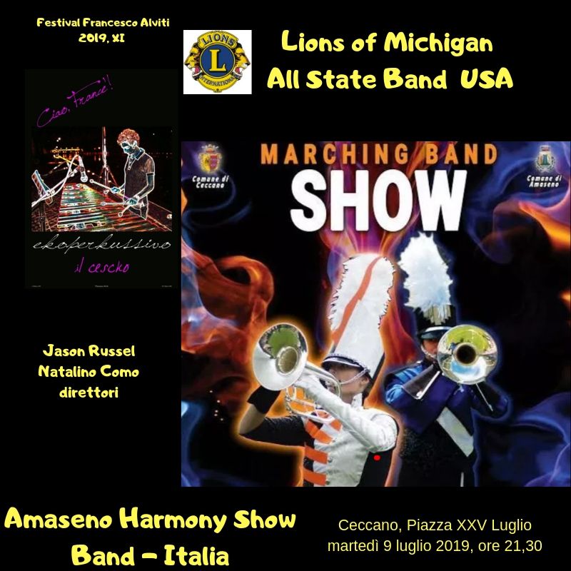 Due marching band, una statunitense e l’altra italiana, concluderanno il Festival Francesco Alviti, martedì 9 luglio, dopo 9 serate di bellissima musica, in un’atmosfera di festa e di commozione. In Piazza XXV Luglio a Ceccano, alle 21,30, si esibiranno i Lions of Michigan All State Band, in tour in Italia per le celebrazioni annuali dei Lions international, e l’Amaseno Harmony show band, in tutto più di 100 musicisti che riempiranno dei loro suoni il centro di Ceccano, salutando così la conclusione dell’XI edizione del Festival Francesco Alviti. Saranno presenti le delegazioni dei Lions Club del territorio