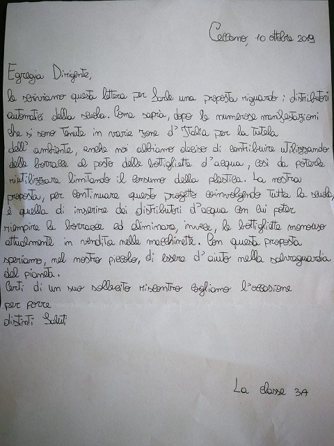 Hanno preso carta e penna, letteralmente, e hanno scritto alla dirigente della scuola: anche noi della classe 3A dell’IC Ceccano 1 vogliamo contribuire alla tutela dell’ambiente con delle borracce al posto delle bottiglie di plastica. Forza ragazzi! Ecco la lettera