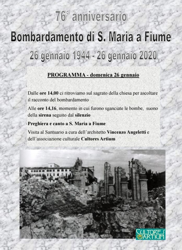76 anni fa, il 26 gennaio 1944, la chiesa di Santa Maria a fiume a Ceccano, veniva distrutta da un bombardamento americano: alle 14 di oggi, domenica 26 gennaio, di fronte al sagrato della chiesa, ci sarà la commemorazione di quel tragico evento che vide la completa distruzione del santuario, tranne che della statua, miracolosamente salvata dall’imballaggio in cui era stata avvolta per essere trasportata a Castel Sant’Angelo a Roma.