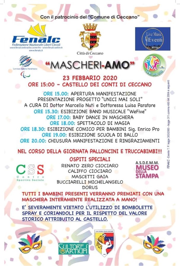 Festa in maschera al castello dei Conti di Ceccano, domenica 23 febbraio a cura del Fenalc: programma ricco per tutto il pomeriggio fino alle 20