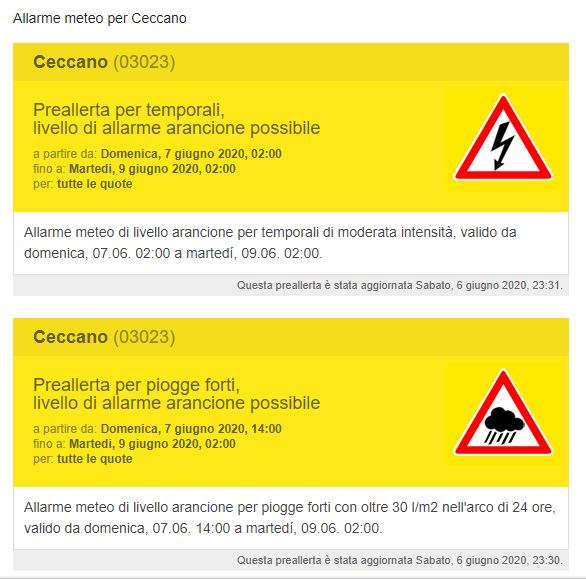 Si attendono forti piogge e temporali per domani lunedì 8 giugno 2020. Una preallerta (livello GIALLO) viene emessa con fino a 48 ore di anticipo, quando l’insorgere del maltempo è ancora incerto oppure si possono verificare cambiamenti nello svolgimento temporale, così come nell’intensità oppure nella direzione dell’evento. Si tratta di allerta meteorologiche che non hanno niente a che fare con quelle della Protezione Civile che tengono conto di tutto il bacino idrografico. Per info