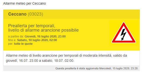 Allarme meteo di livello arancione per temporali di moderata intensità, valido da giovedí, 16.07. 23:00 a sabato, 18.07. 02:00.