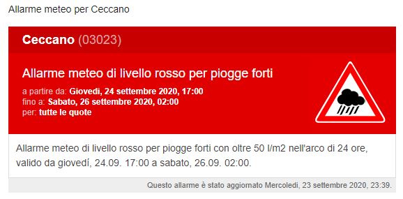 Un’allerta rossa per piogge molto intense è stata emessa per il territorio di Ceccano. Sono previsti oltre 50 litri d’acqua per ogni metro quadrato.