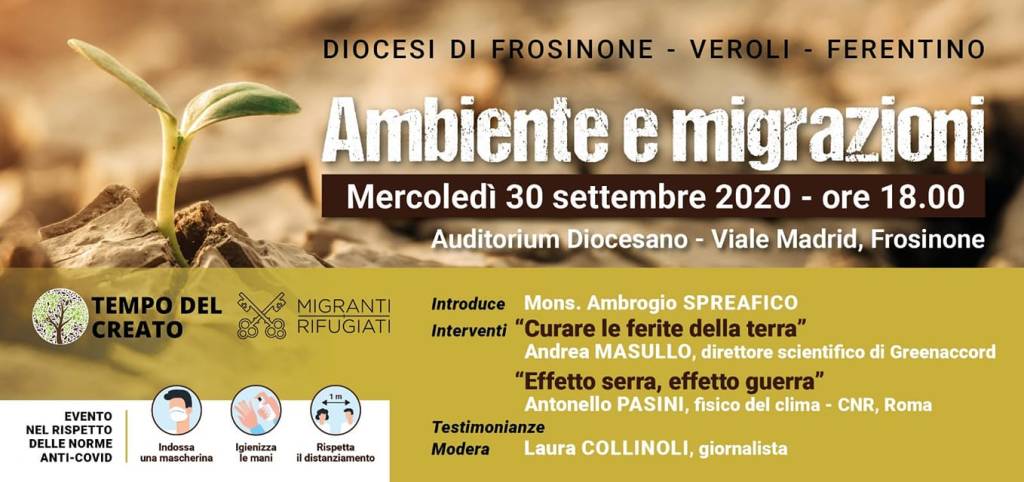 La Diocesi di Frosinone-Veroli-Ferentino promuove, mercoledì 30 settembre alle ore 18:00, presso l’Auditorium S. paolo di Frosinone, un incontro sul tema “Ambiente e migrazioni“, moderato dalla giornalista Laura Collinoli. Proprio in queste settimane siamo invitati a riflettere sulla 106a edizione della Giornata del Migrante e del Rifugiato (il 27 settembre) e sul Tempo del Creato che va dal 1° settembre (Giornata Mondiale di Preghiera per la Cura del Creato) al 4 ottobre (giorno in cui si celebra San Francesco, santo patrono dell’ecologia per molti fedeli).