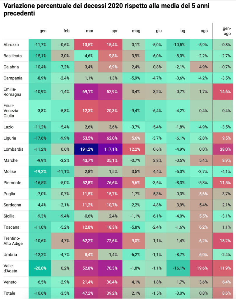 E’ come se fosse scomparsa una città delle dimensioni di Frosinone. Nella sua nuova rilevazione l’ISTAT conferma sostanzialmente quanto aveva già misurato: tra marzo e aprile in Italia ci sono stati circa 48mila decessi in più rispetto alla media degli anni precedenti, contro i circa 29mila attribuiti ufficialmente al coronavirus. Non vuol dire, comunque, che i quasi ventimila decessi di scarto siano interamente attribuibili alla COVID-19, anche perché un’epidemia come quella in corso ha conseguenze anche sulla salute di chi non contrae il virus.