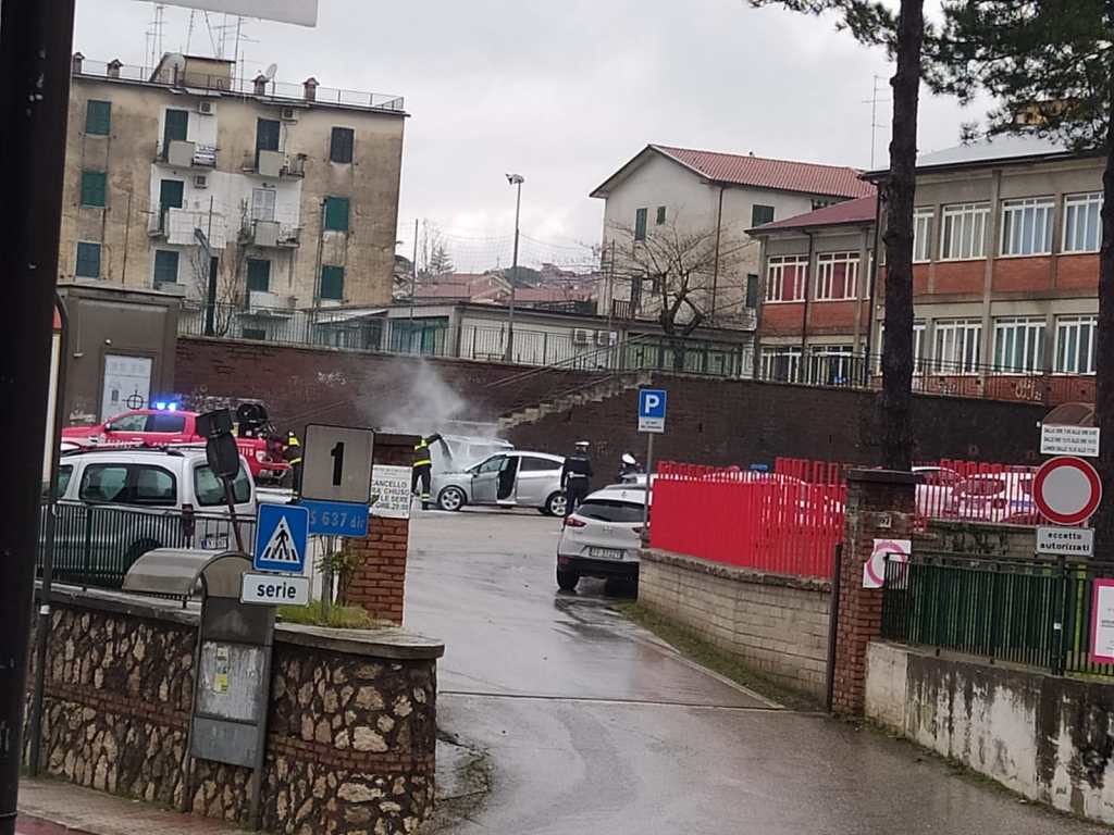 Vigili del fuoco e Polizia Municipale sono intervenuti stamane per spegnere l’incendio di un auto nel parcheggio della scuola elementare Matteotti.
