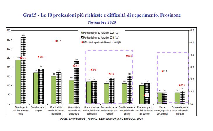 Operai specializzati nell’edilizia e manutentori di impianti, conduttori di mezzi di trasporto, operai metalmeccanici ed elettromeccanici, operatori nell’assistenza sociale, commessi, cuochi: queste le professioni più richieste e con difficoltà di reperimento nella provincia di Frosinone secondo ANPAL.