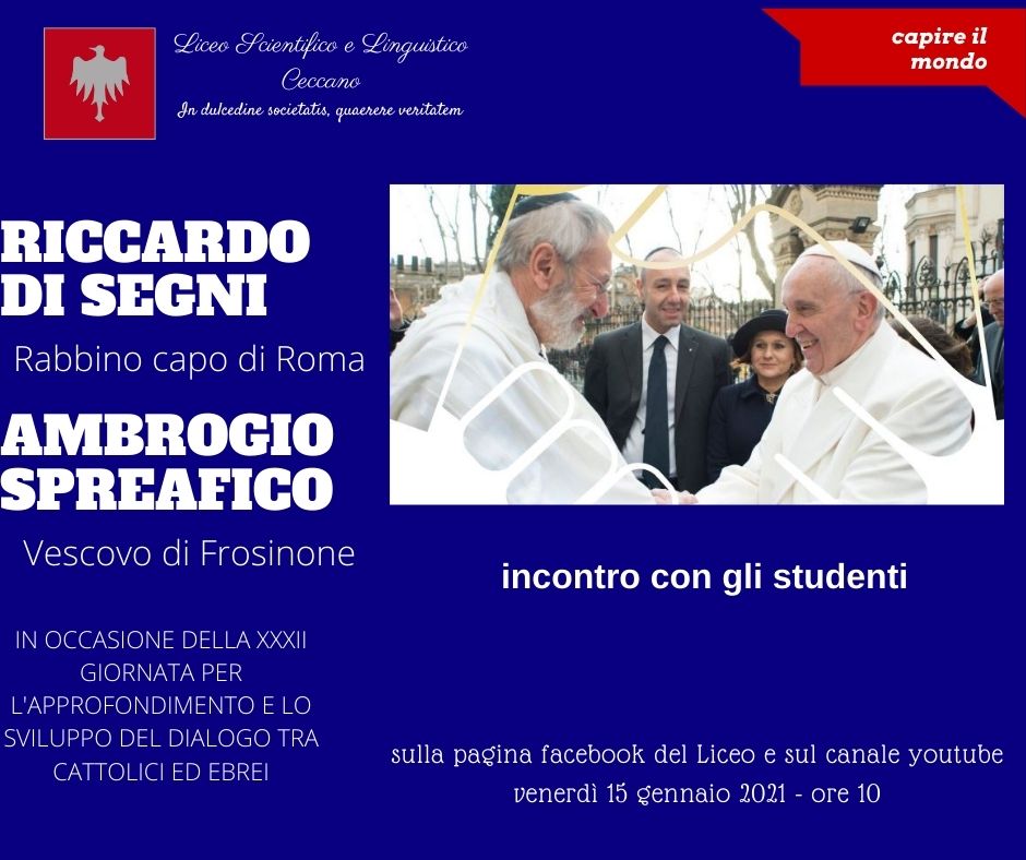 Si sono odiati per secoli: c’è voluto un concilio e la santità di Giovanni XXIII per riavviare un rapporto di rispetto e di fiducia reciproca che però mostra ancora tante crepe nel modo di pensare della gente. E così per discutere di dialogo, religioni, antisemitismo, linguaggi di odio, persecuzioni il rabbino capo di Roma, Riccardo di Segni, e il vescovo di Frosinone, Ambrogio Spreafico, presidente della commissione episcopale per il dialogo interreligioso, incontreranno i ragazzi del Liceo venerdì 15 gennaio alle ore 10. L’incontro sarà pubblico e trasmesso sui canali social del Liceo, facebook e youtube