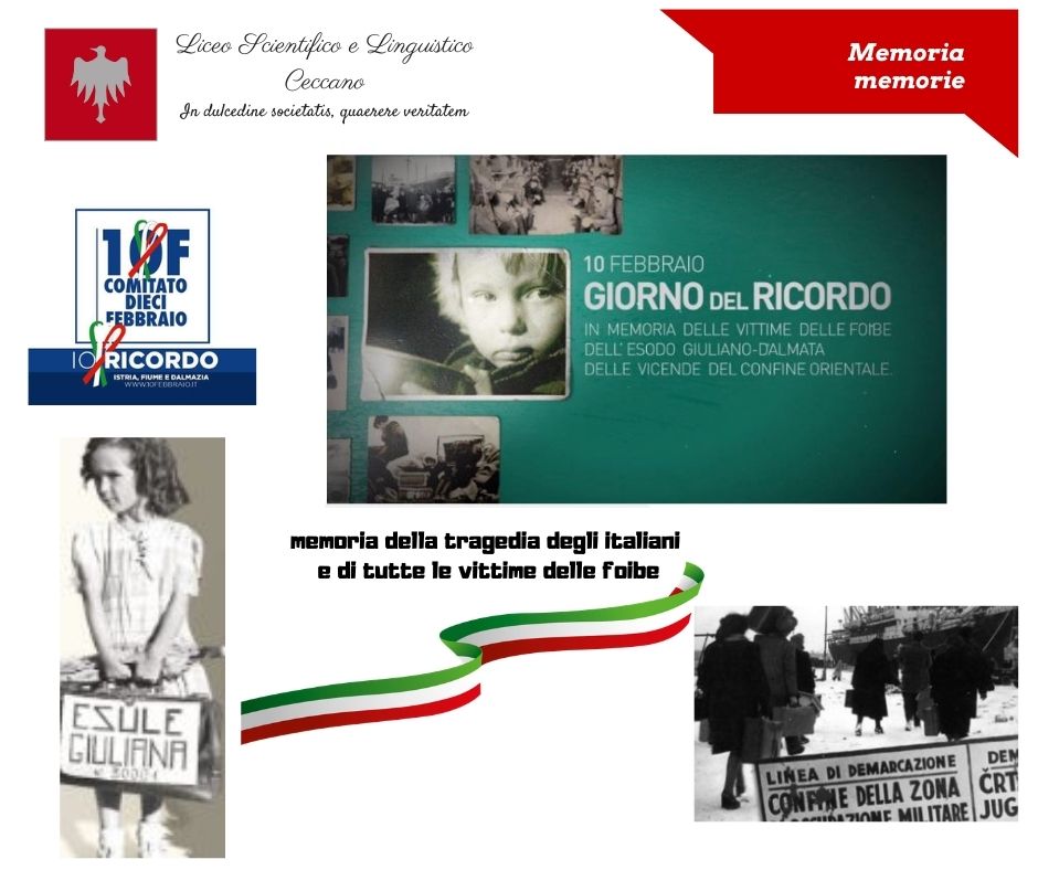 Secondo le indicazioni della Legge 30 marzo 2004, n.92, il Liceo di Ceccano celebra il Giorno del Ricordo, al fine di conservare e rinnovare la memoria della tragedia degli italiani e di tutte le vittime delle foibe, dell’esodo dalle loro terre degli Istriani, Fiumani e Dalmati nel secondo dopoguerra e della più complessa vicenda del confine orientale. Si è trattato di una tragedia consumata su due fronti: eliminazione fisica e esodo. Le uccisioni e il fenomeno dell’esodo, determinato questo sia dal terrore psicologico delle foibe sia dalle deportazioni e dalla perdita della cittadinanza e della propria cultura, hanno riguardato indistintamente militari e civili. La celebrazione del Giorno del Ricordo, il 10 febbraio 2021, recuperando una parte della storia del popolo italiano, può essere l’occasione per conoscere e per capire. Tutti gli insegnanti vorranno dedicare, nella libertà d’insegnamento, i momenti di riflessione che riterranno opportuni.