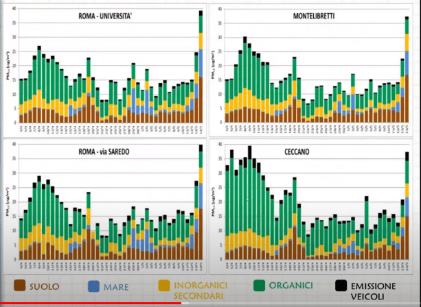 Hanno inserito nella centralina di Ceccano due nuovi sensori, teflon e cristalli di quarzo, per tracciare le polveri generate da fonti organiche. Il CNR ha analizzato i dati e ormai non ci sono dubbi: la mal’aria che respirano i cittadini della Valle Latina, quelli di Frosinone, Ceccano, Cassino, deriva in gran parte dalla legna di combustione. La ricerca è stata effettuata nel periodo del blocco delle attività da marzo a maggio, su tre centraline romane e quella di Ceccano, ed è stata presentata qualche giorno fa all’Arpa, in un convegno la cui registrazione potete vedere qui Il dato più interessante per Ceccano è sia di livello assoluto come potete vedere nella prima immagine, in cui si nota come gli inquinanti organici, quelli della legna da ardere, siano assolutamente prevalenti per la stazione di Ceccano rispetto alle altre tre analizzate; sia di livello relativo per il tracciamento di uno zucchero, il levoglucosano, derivante dalla combustione della legna, la cui presenza potete vedere nella seconda immagine. Naturalmente i valori si abbassano andando verso il mese di maggio, quando i camini non bruciano più. Impressionante anche il dato relativo all’influenza del traffico veicolare, in nero, che per Ceccano è comunque superiore alle tre centraline romane.