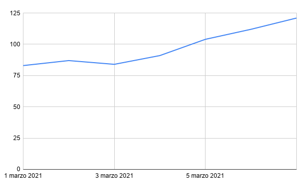 Il 1° marzo erano 83, il 7, 121 con una forte accentuazione della curva negli ultimi giorni ed un aumento di quasi il 50%. Il grafico è elaborato con i dati ufficiali del comune di Ceccano che per ogni giorno riporta il numero dei positivi al covid sars-2 tra i residenti. Sono numeri che ci collocano ampiamente in zona rossa, con una media settimanale di 91 in aumento. Per uscirne dovremmo averne 57…