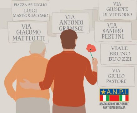 L’appuntamento alle ore 16 in Via Sandro Pertini, (il presidente partigiano, membro del Comitato di Liberazione Nazionale, più volte imprigionato durante il ventennio, ndr.) da dove partirà la manifestazione, che si concluderà in Piazza 25 Luglio (che ricorda la caduta del fascismo in Italia, con l’ordine del giorno del Gran Consiglio che sfiduciava Mussolini, ndr.) con l’omaggio alla lapide di Luigi Mastrogiacomo (guardia di finanza, aggregato alla resistenza romana, trucidato alle Fosse Ardeatine, cui è dedicata anche la scuola elementare di via Matteotti, ndr.), passando per via Antonio Gramsci (fondatore del Partito Comunista, morto dopo tanti anni di carcere durante il ventennio, ndr.) via Bruno Buozzi (ucciso dai tedeschi in ritirata il 4 giugno 1944 a La Storta, ndr.) via Giulio Pastore (dirigente dell’Azione Cattolica e sindacalista, arrestato nel 1942, liberato l’8 settembre 1943, ndr.) via Giuseppe Di Vittorio (più volte carcerato, esiliato, confinato a Ventotene, combattente nella resistenza sia in Francia che in Italia, ndr.), via Giacomo Matteotti ( deputato socialista, ucciso da squadristi a Roma, per ordine di Mussolini, il 10 giugno 1924, ndr.)