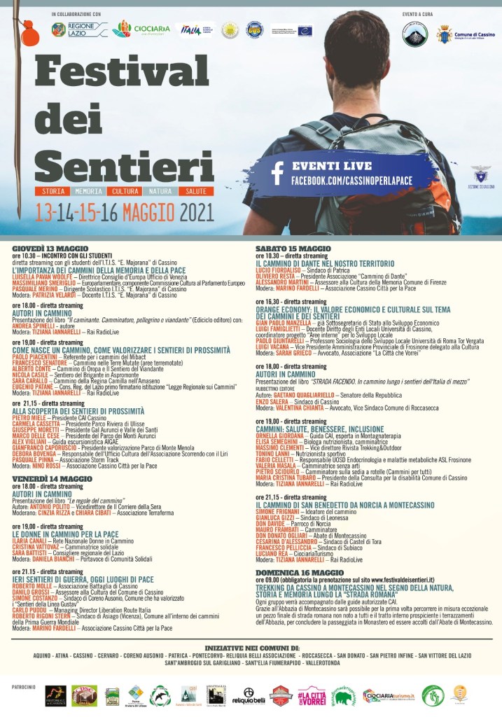 Si svolgerà dal 13 al 16 maggio il Festival dei sentieri dell’Associazione Cassino città per la pace, iniziativa nata per promuovere il nostro territorio. Così, chi vorrà, potrà essere guidato domenica 16 maggio per i tanti percorsi proposti dal festival: sentiero dei contrabbandieri, sentiero delle miniere, sentiero della guerra e anche il sentiero di Dante a Patrica, il cui comune ha aderito all’iniziativa. Chi volesse partecipare può rivolgersi all’Associazione Cassino città per la Pace o sul sito del festival festivaldeisentieri.it