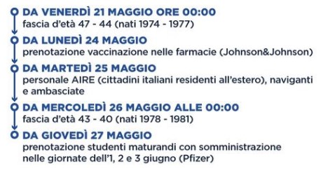 Da lunedì 24 maggio sarà possibile prenotare il vaccino contro il covid nelle farmacie della regione Lazio. Dal 1° giugno sarà somministrato il vaccino monodose Johnson & Johnson, sempre seguendo il criterio della gradualità. Inoltre dal 26 maggio sarà possibile prenotarsi per chi è nato negli anni 1978 -1981, mentre da giovedì 27 maggio ci sarà la prenotazione dei maturandi che potranno essere vaccinati dal 1 al 3 giugno.