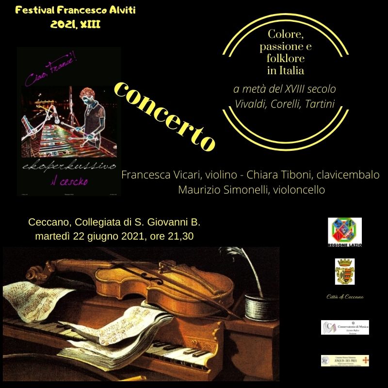 Sarà la musica di Vivaldi ad inaugurare la 13a edizione del Festival Francesco Alviti martedì 22 giugno alle ore 21,30 nella Collegiata di S. Giovanni Battista a Ceccano, per la Festa Europea della Musica 2021: insieme a Vivaldi potremo ascoltare Corelli e Tartini nella serata dedicata a Colore, passione, folklore in Italia nella metà del XVIII secolo con Francesca Vicari al violino, Maurizio Simonelli al violoncello e Chiara Tiboni al clavicembalo, a cura del coordinamento di Musica Antica del Conservatorio Licinio Refice di Frosinone. Tutti i concerti del Festival si svolgeranno in S. Giovanni, per le regole dettate dalla pandemia. Il giorno successivo, sempre per la Festa della Musica, alle 19,15, Psallite in organo et tuba, concerto per organo e tromba in onore di S. Giovanni Battista, con musiche di Couperin, Telemann, Bach. Al nuovo organo della Collegiata, realizzato in memoria di Francesco Alviti, ci sarà Guido Iorio, alla tromba Massimiliano Malizia. Il giorno dopo, Natività di S. Giovanni, sempre alle 19,15, il Festival ospiterà uno dei più grandi organisti viventi, Juan Paradell Solé, spagnolo, organista emerito della cappella musicale pontificia “Sistina”, che presenterà un programma di grande musica organistica con l’antico organo Catarinozzi del 1736. Il giorno dopo, 25 giugno, alle 21,30, di Wolfgang Amadeus Mozart, sarà eseguita la Gran Partita K. 361, per 13 strumenti a fiato e contrabbasso. Il concerto ha come titolo Die Harmonie Musik ed è dedicato alla salvaguardia del creato. L’orchestra sarà diretta da Silvano Mangiapelo. Gli ultimi due appuntamenti vedranno in scena lunedì 28 giugno, alle 21,30 i solisti del Concentus Musicus Fabraternus Josquin Des Pres nella serata Un palco all’opera, L’anima religiosa del melodramma con la direzione di Mauro Gizzi. Il Festival proseguirà il giorno successivo 29 giugno, alle 21,30, con un altro concerto a cura del dipartimento di musica antica con Et è pur dunque vero, Canzoni da cantare e da suonare nell’Italia del Seicento con Furio Zanasi, baritono, Chiara Tiboni, clavicembalo, e Simone Vallerotonda alla tiorba. Conclusione mercoledì 30 giugno, alle ore 21,30, con un quintetto, archi e pianoforte: Bach Mozart, musica per giovani, con Alessio Gizzi, Giulio Di Gioia, violini, Pierpaolo Rossi, viola, Gaia De Vittoris, violoncello, Marica Staccone, pianoforte. Non ci saranno programmi di sala: tutto sarà disponibile sul proprio telefonino grazie ad un qr code. Il Festival gode del patrocinio della Regione Lazio, del Comune di Ceccano e del Conservatorio Licinio Refice di Frosinone, impegnato appieno con il Dipartimento di Musica Antica, coordinato da Chiara Tiboni.
