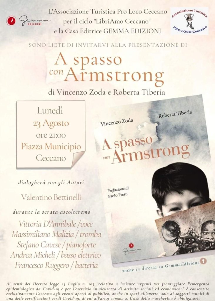 E’ stato una dei grandi interpreti del jazz, capaci di trasformare la musica di un territorio in una delle più grandi espressioni artistiche del XX secolo: a Louis Armstrong è dedicato il libro “A spasso con Armstrong”, edito da Gemma Edizioni e scritto da Vincenzo Zoda e Roberta Tiberia, che, lunedì 23 agosto 2021, alle ore 21, in Piazza Municipio a Ceccano dialogheranno con Valentino Bettinelli. Si tratta del primo appuntamento della rassegna #LibriAmoCeccano, curata dalla Pro Loco che si presenta dopo il rinnovo del direttivo. La serata sarà accompagnata da momenti musicali, con i più grandi successi del grande musicista statunitense, grazie alla voce del soprano Vittoria D’Annibale, alla tromba di Massimiliano Malizia, alla chitarra basso di Andrea Micheli, la batteria di Francesco Ruggeri e al pianoforte di Stefano Cavese. Appuntamento lunedì 23 agosto alle ore 21:00 in Piazza Municipio.