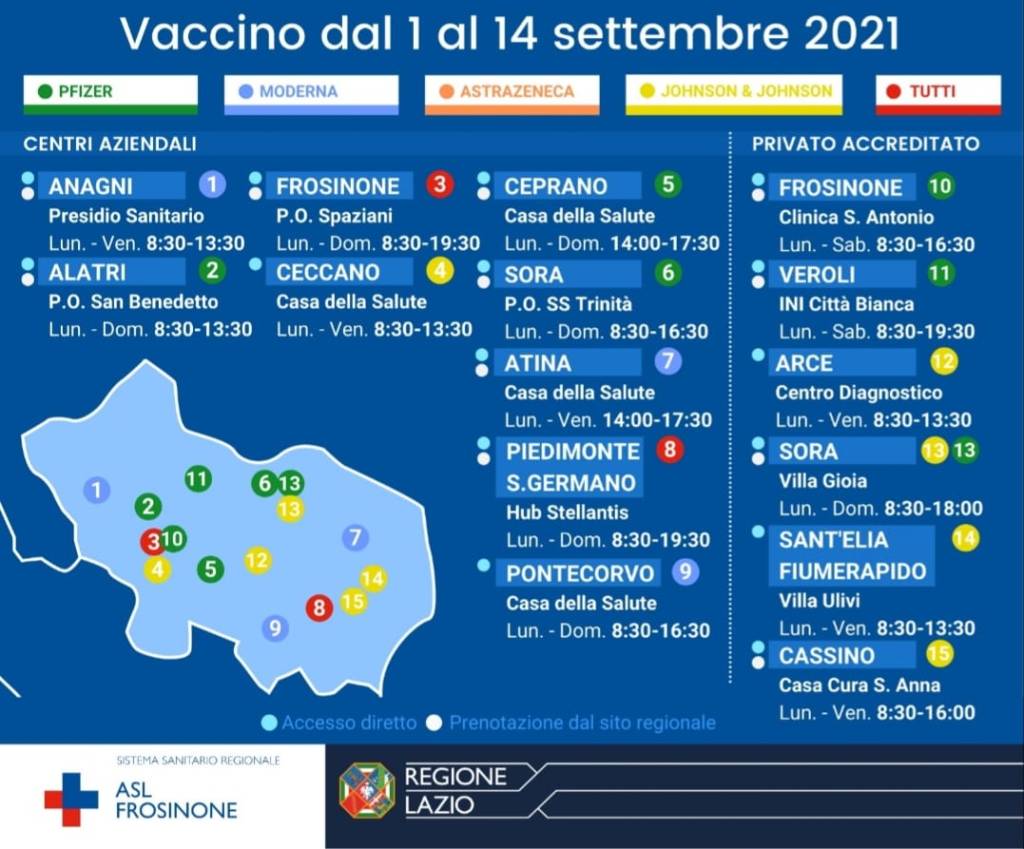 La Asl di Frosinone ha pubblicato una mappa con le indicazioni di tutti i centri vaccinali, con i relativi farmaci che dal 1° settembre saranno iniettati a chi si presenterà anche senza prenotazione. A Frosinone e alla Fiat sarabnno disponibili tutti i vaccini, a Ceccano soltanto il monodose Johnson & Johnson. E’ sufficiente portare con sé la tessera sanitaria e un documento.