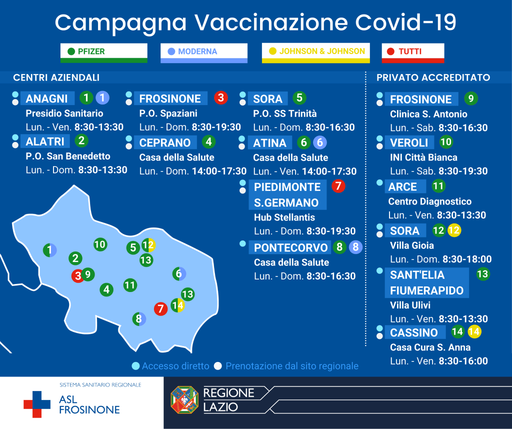 tutti colori i quali sono stati vaccinati con il vaccino monodose Johnson & Johnson, da almeno 180 giorni e a prescindere dall’età (vale a dire anche per gli under 60) possono fare la dose di richiamo con dosaggi autorizzati per il “booster” (#Pfizer o #Moderna) nelle sedi aziendali di #ASLFrosinone presso il proprio medico di medicina generale, presso le farmacie e presso i centri privati accreditati.La vaccinazione viene effettuata con accesso diretto o attraverso la prenotazione dal sito regionale https://prenotavaccino-covid.regione.lazio.itNella mappa, tutti i punti dove poter effettuare la dose.