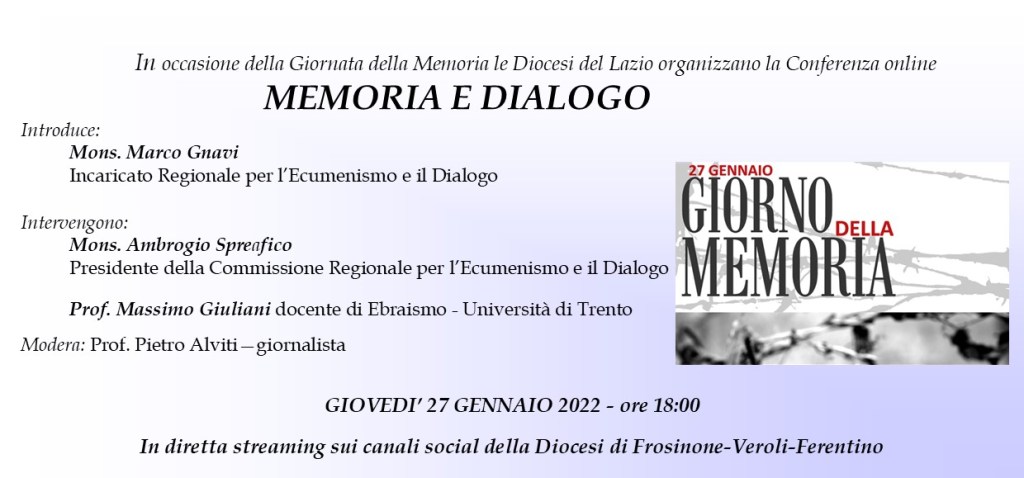 In occasione della “Giornata internazionale di commemorazione in memoria delle vittime della Shoah” le Diocesi del Lazio promuovono un incontro di formazione e di approfondimento sul tema “Memoria e dialogo”. L’Assemblea generale delle Nazioni Unite istituì la Giornata il 1° novembre del 2005 e la celebrazione annuale del 27 gennaio ricorda l’entrata delle truppe sovietiche nel campo di concentramento di Auschwitz, avvenuta il 27 gennaio del 1945.