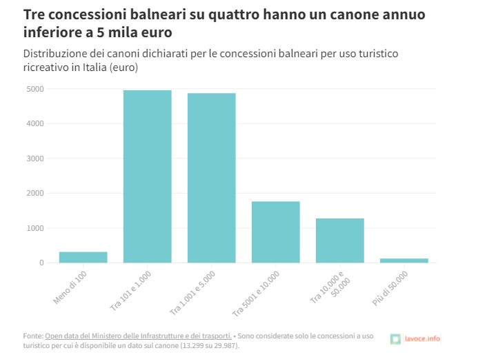 Delle oltre 13 mila concessioni balneari per uso turistico ricreativo di cui sono disponibili dati sul canone (in totale, le concessioni di questo tipo sono 29.987), solo 3157 prevedono un canone annuo superiore a 5 mila euro. Le concessioni con un canone inferiore a mille euro sono invece quasi il 40 per cento del totale (5271, tra cui 312 con un canone inferiore a 100 euro). Il costo medio di locazione è 5180 euro, ma più della metà delle concessioni prevede una cifra inferiore a 2 mila euro (la mediana è infatti pari a 1728 euro).
