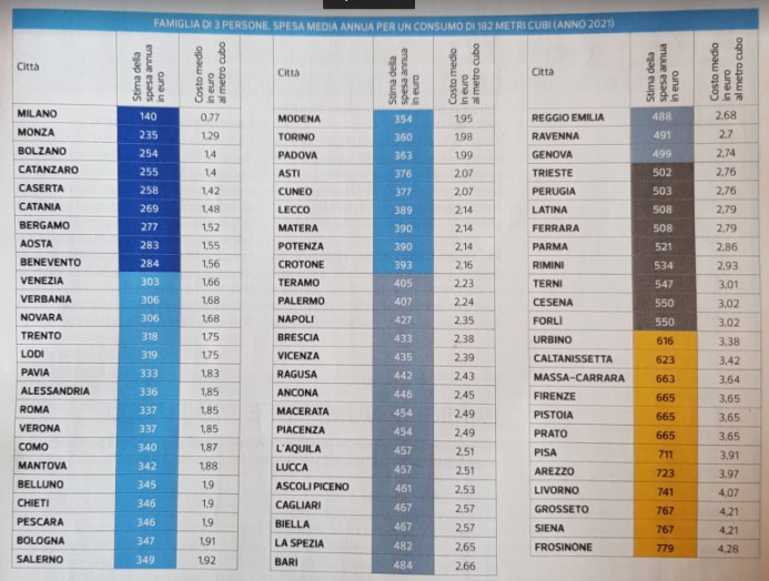 Lo mostra un’inchiesta di Altroconsumo che ha stilato la classifica del costo dell’acqua pubblica in tutto il territorio nazionale. La situazione per la provincia di Frosinone è impietosa: con 4,28 euro al metro cubo i cittadini frusinati pagano l’acqua pubblica quasi 5 volte in più di quelli di Milano. Per una famiglia di 3 persone significano rispettivamente 779 euro annui contro i 140 di quella di Milano. A Roma, l’acqua costa 1,85, pur essendo sempre gestita da Acea. Forse sarebbe necessaria una riflessione attenta ed una presa di consapevolezza da parte della conferenza dei sindaci.