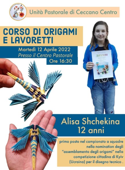 A Kiyv era la campionessa cittadina di disegno tecnico: ora, in fuga per la guerra, è ospitata dalle parrocchie di Ceccano ma ha voluto subito ricambiare. Così, Alisa Shchekina insegnerà a costruire origami ai bambini martedì 12 aprile, alle 16,30, al centro pastorale di via Roma.